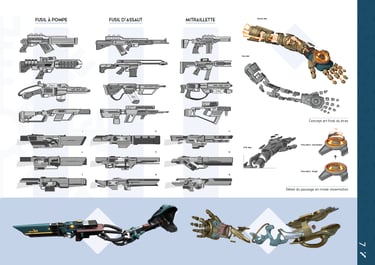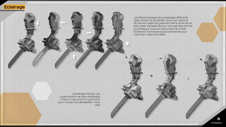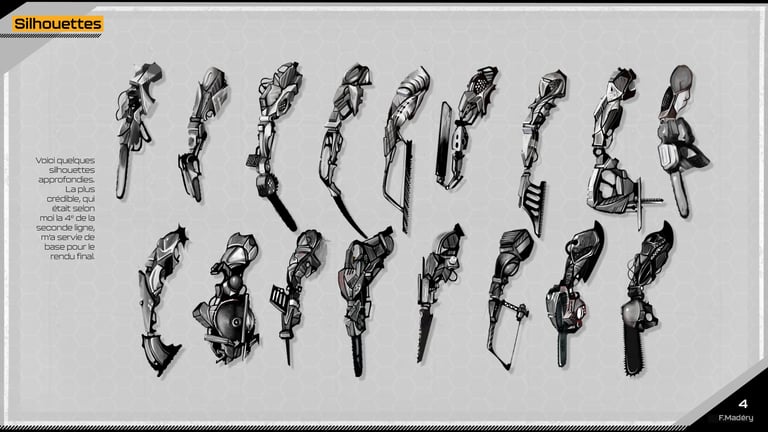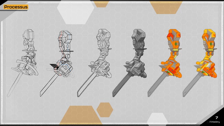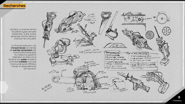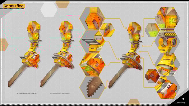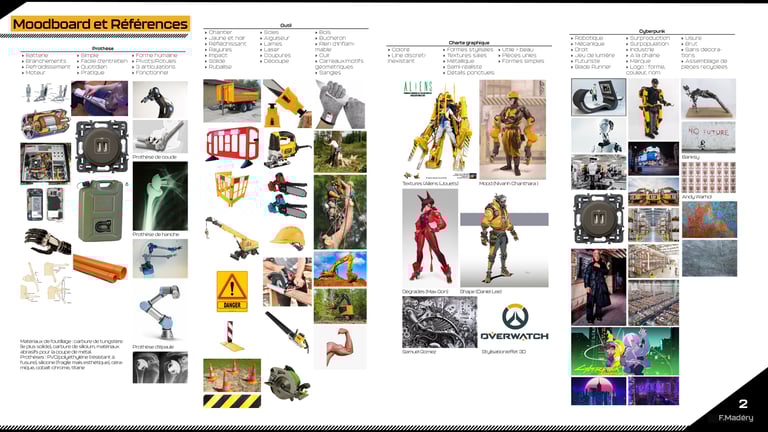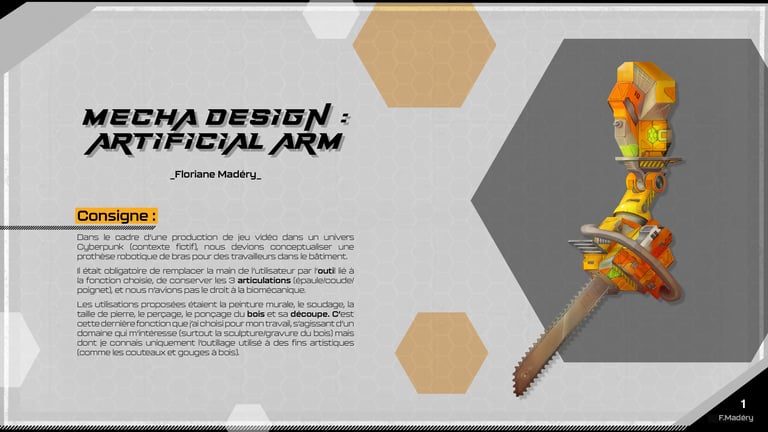 Dans le cadre d'un projet de jeu vidéo Cyberpunk, nous devions conceptualiser une prothèse robotique de bras pour des travailleurs du bâtiment, en remplaçant la main par un outil spécifique tout en conservant les articulations principales. Nous avions déjà réalisé cet exercice durant un examen, mais cette fois, nous disposions de plus de temps pour approfondir notre travail.